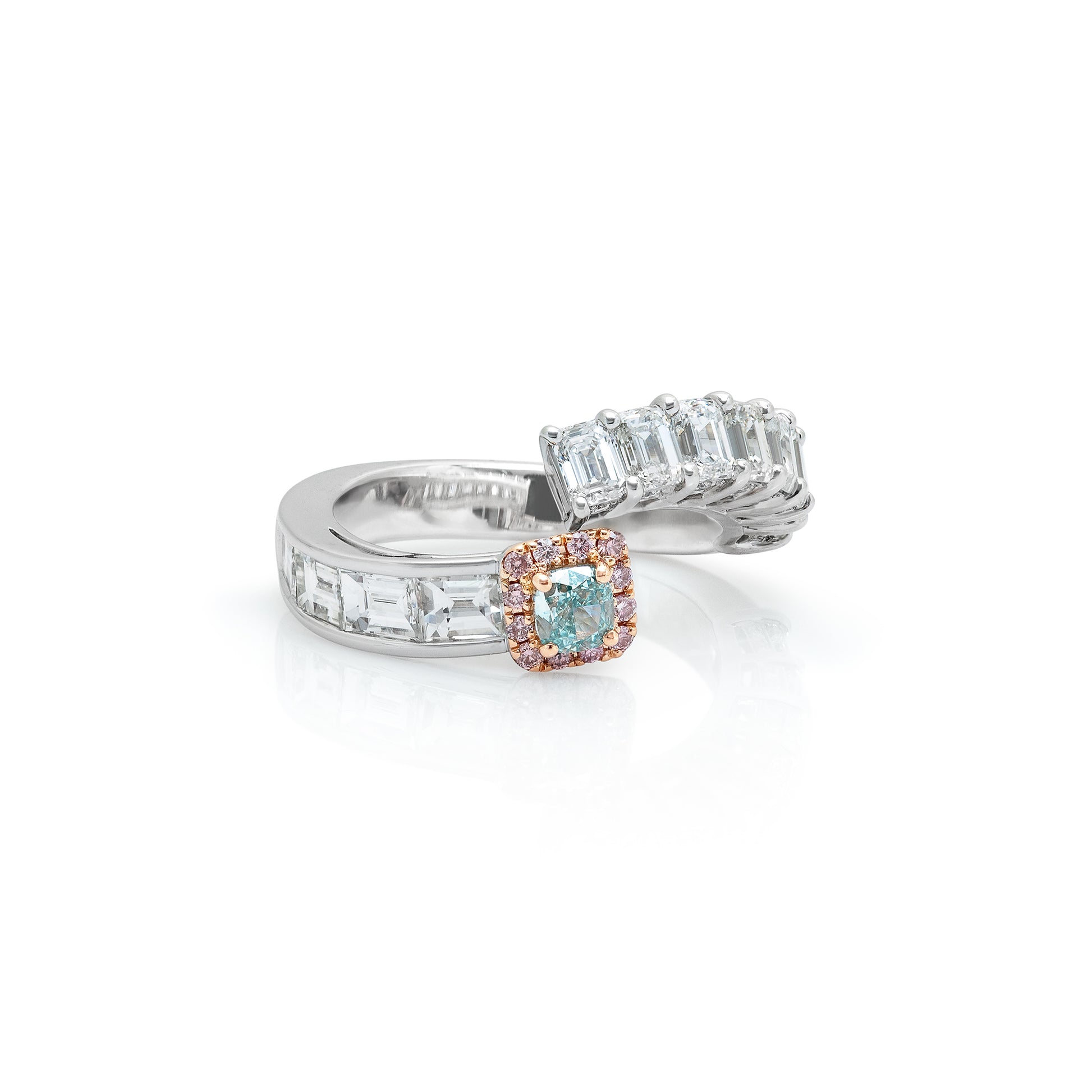 A mesmerising blue diamond 0.31ct (GIA Certified) takes center stage, surrounded by a warm embrace of natural pink diamonds creating a stunning halo effect. The sleek white gold band, inlaid with elegant baguette diamonds, accentuates the central gem's intense hue and sparkle. This ring is a fusion of bold color and classic elegance.
